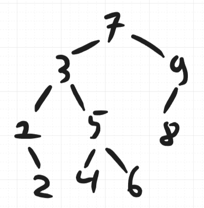 We insert following a standard BST algorithm and at every point we’ll check if any nodes are unbalanced. Our first unbalanced situation is this one: