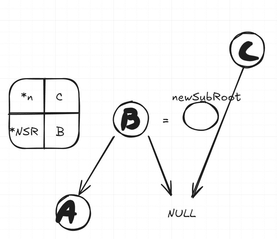 We then reassign the n pointer to point to the same node as the n pointer. In this case, n who was pointing to C now points to B. Since we pass the node pointer n by reference, this will modify the tree in place so that we don’t have to rely on the return value to reassign a root, and instead just run the function and potentially ignore the return value and it will still work.