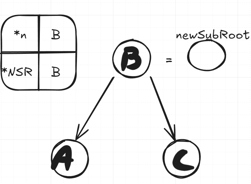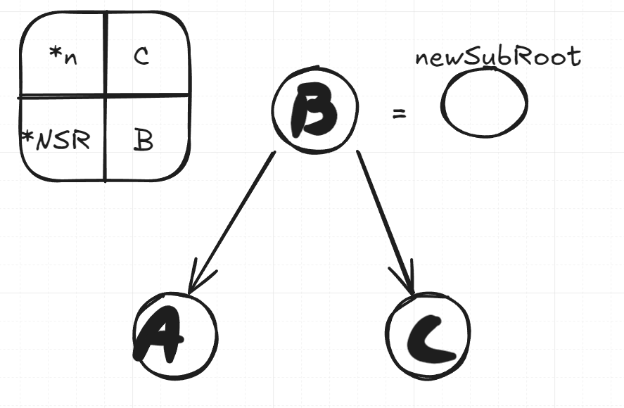 We first create a new sub root to serve as a dummy node so we don’t lose anything when we swap nodes. It’s a node pointer, and it points to the original root node’s left child, effectively being a copy of B. Keep in mind that n here in the above algorithm is the node C. We’ll keep track of what n and newSubRoot are pointing to as well at each step.