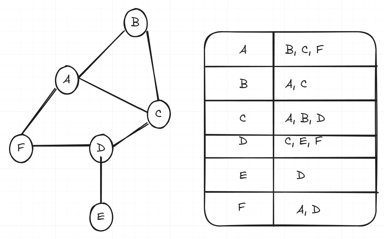 Visiting A first, we push B, C, F on the stack. We then pop B, mark it as visited, and push A and C on the stack. Our stack now contains from top to bottom, A, C, B, C and F. Since we’ve already visited A, we pop and skip it. We pop C, which is is unvisited so we push A, B and D on the stack. A and B have both been visited, so we visit D. We push C, E and F on the stack. C has already been visited, so we visit E. E only has D, which we push and ignore. F is next, we visit F and push A and D onto the stack. All the nodes have been explored, so we iterate and skip the rest of them and complete our traversal. The final order of our traversal was A, B, C, D, E, F.